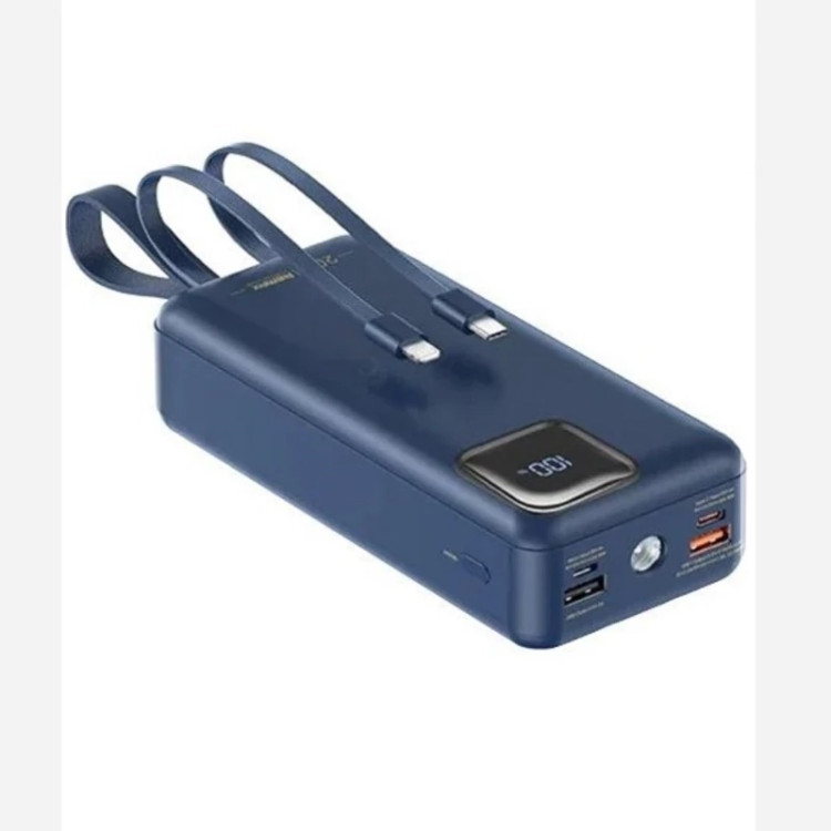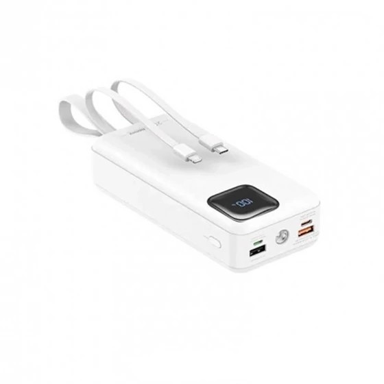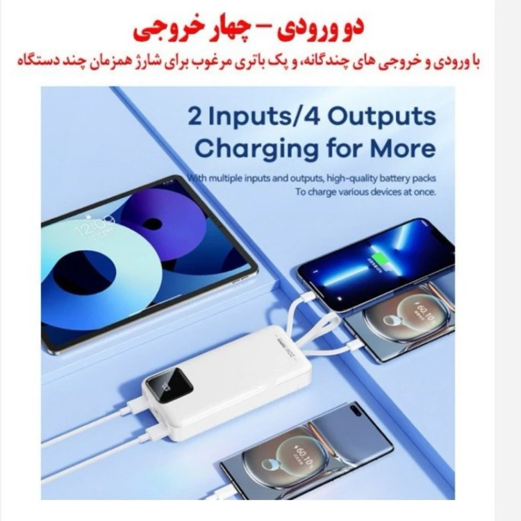 ظرفیت 30000 میلی آمپر دارای دو عدد کابل سرخود تایپ سی و لایتنینگ دارای صفحه نمایش درصد شارژ دارای 4 عدد خروجی دارای 2 عدد ورودی دارای خروجی 20 وات و 22.5 وات قابلیت فست شارژ