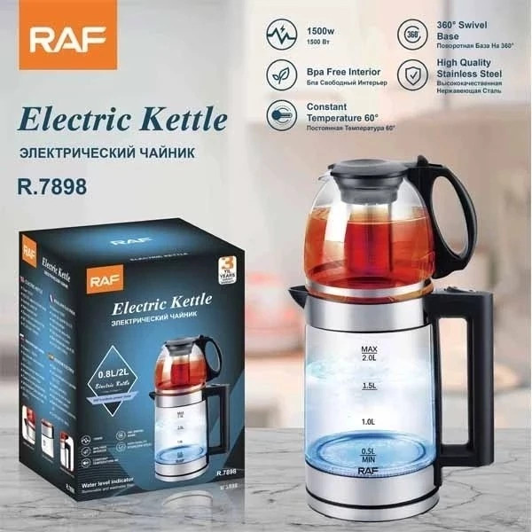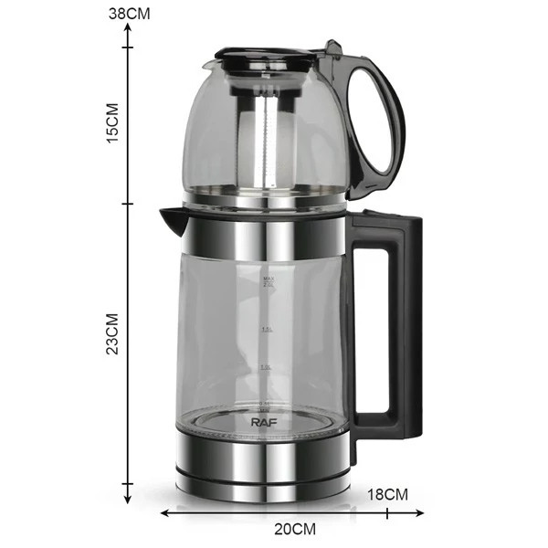 چای ساز روهمی 1500 وات راف مدل 7898 چای ساز روهمی 1500 وات راف مدل 7898 از سری محصولات باکیفیت و کاربردی برند RAF است که در بازار ایران به دلیل محبوبیت نوشیدنی چای، این محصول نیز فروش خوبی دارد. این چای ساز از جنس پیرکس بسیار باکیفیت و نشکن ساخته شده و با توان مصرفی 1500 وات، کتری پیرکس 2 لیتری و قوری پیرکس 0.8 لیتری در کمترین زمان ممکن حدوداً 5دقیقه آب جوش و چای شما را آماده خواهد کرد و به لطف جنس عایق این چای ساز تا مدت زیادی آب جوش، چای یا دمنوش شما گرم خواهد ماند. ✅️چای ساز روهمی 1500 وات راف مدل 7898 ✅️تضمین اصالت و سلامت فیزیکی کالا ✅️توان : 1500 وات ✅️گنجایش کتری : 2.2 لیتر ✅️گنجایش قوری : 0.8 لیتر ✅️جنس بدنه پیرکس بسیار باکیفیت و مقاوم در برابر ضربه ✅️المنت پرقدرت حرارتی و کفی استیل ضدزنگ ✅️عایق دوجداره ✅️ظاهر شیک و زیبا ✅️دارای فیلتر جنس استیل