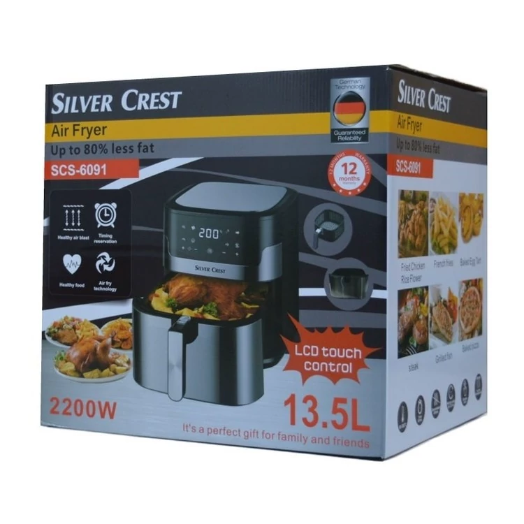 سیلور کرست 6091 ❌️ظرفیت : 13.5 ❎️حداکثر توان مصرفی : 2200 ❌️تعداد برنامه پخت : 8 برنامه ❎️سبد جداشونده : دارد ❌️وزن :7تا 8 کیلو ❎️نوع صفحه نمایش : لمسی از نوع ال ای دی ❌️میانگین دما : 80 تا 200 درجه ❎️پایه ضد لغزش : دارد ⚠️اصالت کالا : اصل دارای پنل لمسی بسیار باکیفیت است. همچنین این سرخ کن با داشتن 8 برنامه پیش فرض ، قفل کودک، امکان تنظیم دما، سبد جدا شونده، جنس استیل ضد زنگ و طراحی بسیار زیبا که به صورت سفارشی ساخت شده است گزینه بسیار مناسبی برای همراهی بانوان در آشپزخانه است.