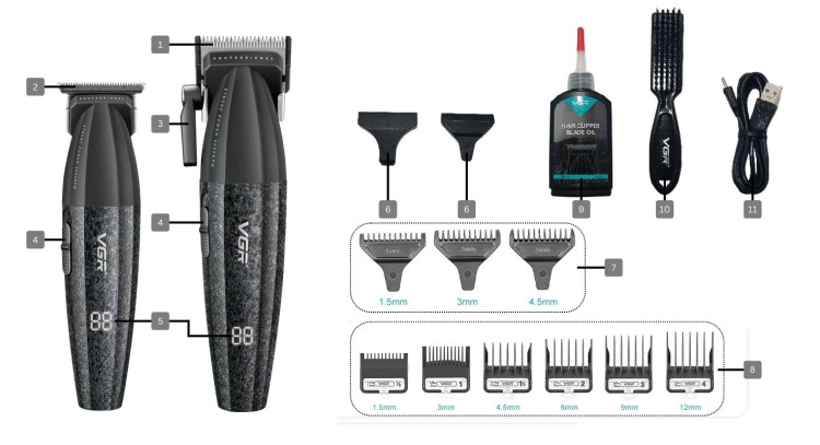 3 عدد شانه , سیم شارژر , 6 عدد شانه , برس پاکسازی مخصوص , روغن 55ml