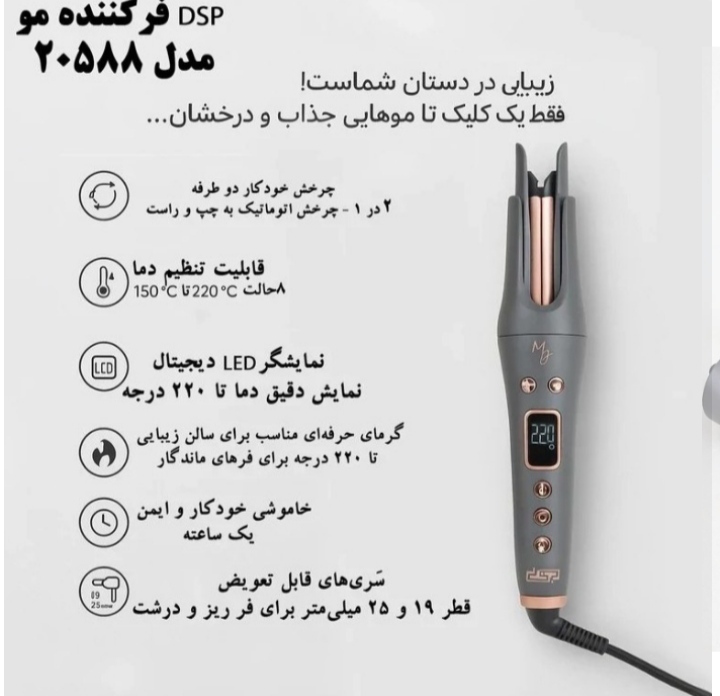 فر کننده موی اتوماتیک دی اس پی مدل DSP 20588، یک ابزار حرفهای و پیشرفته برای حالتدهی به موهاست که با طراحی مدرن و تکنولوژی سرامیکی، تجربهای بینظیر از فر کردن مو را برای شما فراهم میکند. این دستگاه با قابلیت چرخش خودکار دوطرفه، امکان ایجاد فرهای زیبا، یکدست و ماندگار را تنها با فشردن یک دکمه به شما میدهد. وجود دو سری قابل تعویض با قطرهای 19 و 25 میلیمتر این امکان را فراهم میسازد که بسته به سلیقه خود، موها را به صورت فر ریز یا درشت حالت دهید. المنت حرارتی با روکش سرامیکی لعابی از موها در برابر آسیب حرارتی محافظت کرده و مانع وز شدن آنها میشود. نمایشگر دیجیتال LED و قابلیت تنظیم دما در بازهای از 150 تا 220 درجه سانتیگراد، استفاده از این دستگاه را برای انواع موها مناسب میسازد. طراحی ارگونومیک، خاموشی خودکار پس از 60 دقیقه، کابل چرخشی 360 درجه و وزن سبک، این فر کننده را به گزینهای ایدهآل برای استفاده در منزل یا سالنهای زیبایی حرفهای تبدیل کرده است. اگر به دنبال راهی سریع، ایمن و حرفهای برای حالت دادن به موهای خود هستید، فر کننده مو DSP مدل 20588 با عملکرد قدرتمند و کیفیت ساخت بالا، بهترین انتخاب برای شماست.
